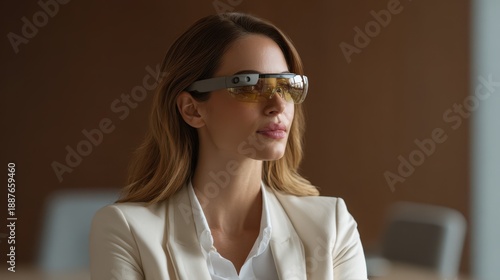 Business professional wearing AR glasses during a meeting effortlessly reading realtime translated notes on a digital screen overlay.