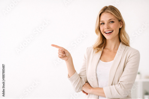 Uśmiechnięta kobieta wskazująca palcem na białym tle