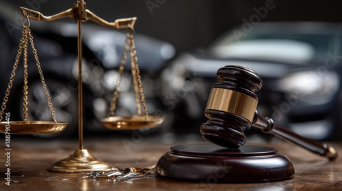 Gavel, scale, and damaged car symbolize wrongful death legal claim and courtroom justice.