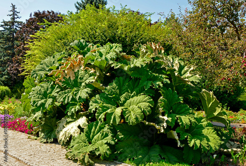 ogromne liście Gunnery olbrzymiej, wielka kępa gunnery olbrzymiej rosnąca w ogrodzie przy ścieżce, Gunnera manicata, huge leaves of giant gunnera, a large clump of giant gunnera growing in the garden