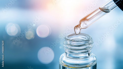 Cosmetic dropper releasing serum into a bottle, symbolizing skin care, beauty treatment, and scientific innovation