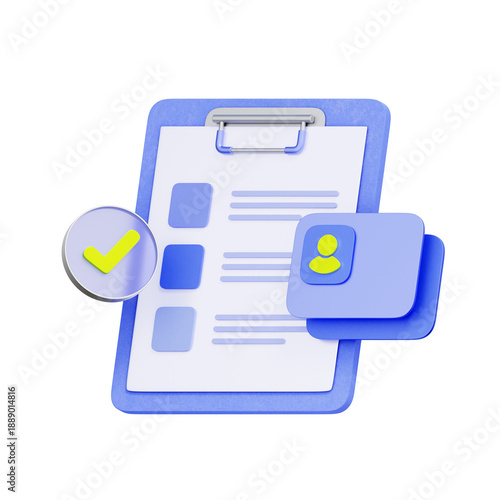 3D icon of a clipboard with check mark and user card for verified service, identity verification, background check, and compliance management.