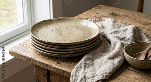 Stos ceramicznych talerzy w rustykalnej kuchni