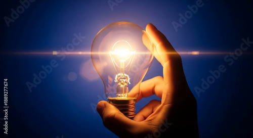 Hand holding glowing lightbulb against dark-blue background, symbolizing ideas, innovation, and solutions