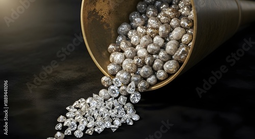 Rough mineral spheres spilling from a golden vessel metamorphose into sparkling faceted diamonds, a powerful visual metaphor for refining potential and creating value from raw materials