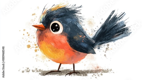 Cute digital illustration of a colorful, fluffy bird with expressive eyes, created in a charming artistic style with playful watercolor splatters