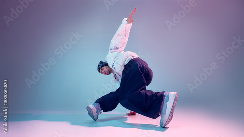 Breakdance dancer performing floor balance move in studio with gradient light background. Concept of street dance training, body control, flexibility, modern choreography, and youth culture.