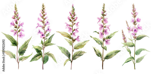 Watercolor botany illustration with pink flowers isolated on transparent background.