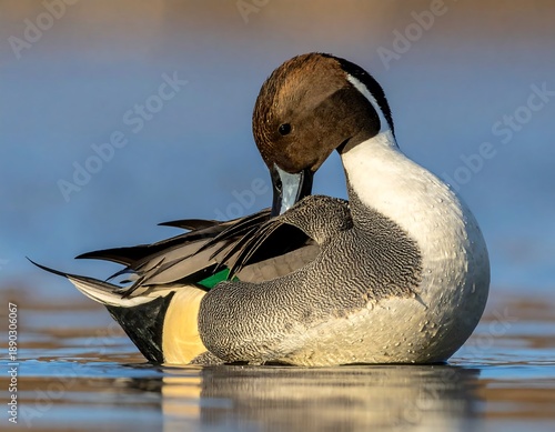 Pintail duck preening, brown head and white chest, on water. Sunlit, clear sky reflection on pond surface