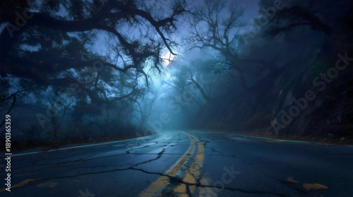 A mysterious road through a foggy horror forest at night, cracked asphalt highway with blue mist and scary trees, halloween drive concept.