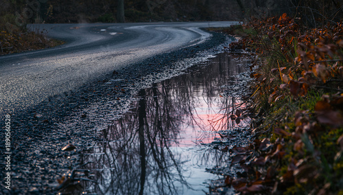 雨上がりの夜明け、濡れたS字の路面に空の色が映り込む