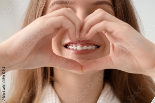 Smiling young woman with dental braces making heart gesture in bathroom, closeup
