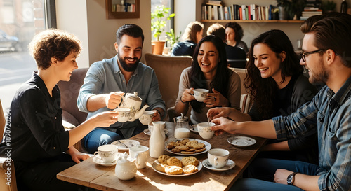 Happy young people sitting at a wooden table talking and laughing while drinking hot beverages and eating snacks