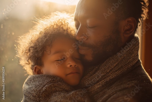 Happy African American father enjoying a serene moment holding his child close in a cozy indoor setting during sunset, capturing the essence of love and warmth