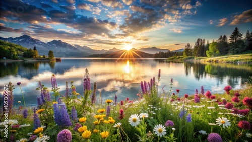 Serene lake landscape serenades with vibrant wildflowers in full bloom