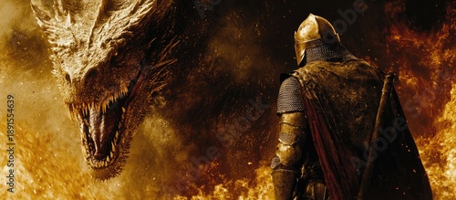 Golden Armored Knight Faces Roaring Dragon in Fiery, Epic Fantasy Confrontation