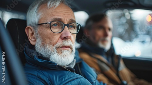 Elderly men in public transport with a pensive look will emphasise the theme of social support or intergenerational interaction, ideally suited as an emotional backdrop