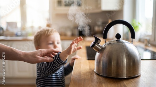 Parent Hand Stopping Toddler Reaching for Hot Boiling Kettle in Kitchen
