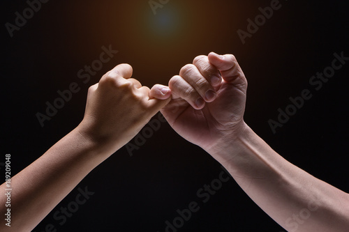 Closeup human hand ,Hook each other's little finger,on black background,blurry light around.to be sign and symbol to promise between man and woman,Love concept