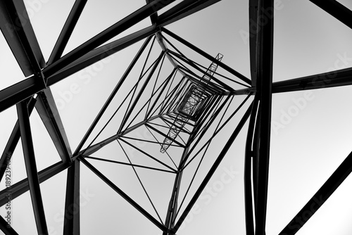 High voltage pylon for energy supply without power cables seen from underneath in frog perspective with vanishing point. Contrasting metal structure with unsymmetrical design, black and white