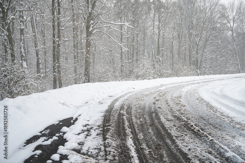 Zdjęcie zaśnieżonej i zamglonej drogi w trudnych warunkach zimowych, ilustrujące wyzwania i zagrożenia związane z jazdą samochodem w śniegu i mgle.