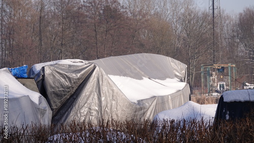 Łodzia i jachty przykryte plandeką w suchym doku podczas zimy. Plandeka pokryta grubą warstwą śniegu.