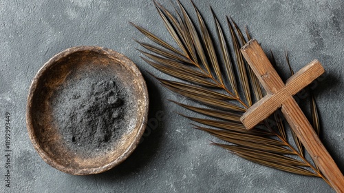 A symbolic arrangement of Ash Wednesday elements on a gray background