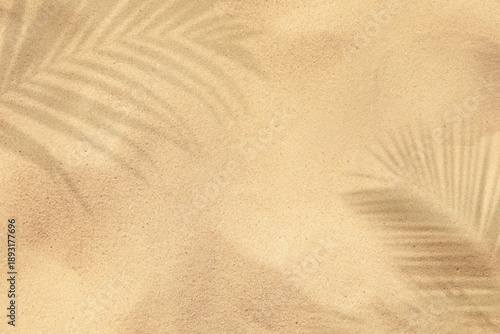Golden sand with shadow of palm leaves, top view. Summer time