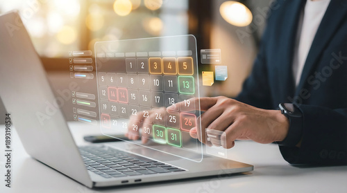 Man organizing schedule on futuristic digital calendar interface on laptop, planning tasks and appointments