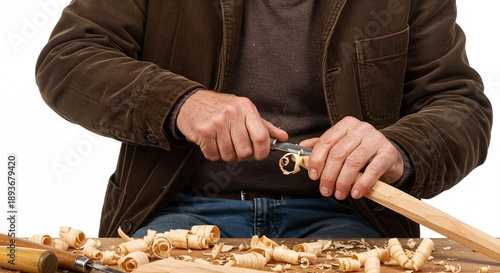 明るい光が照らす作業台で男性が木材を丹念に手彫りする熟練の職人技 舞い散る削りカスが創造性を語る瞬間. AI Generated