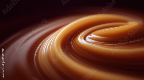 Close-up of a swirl of caramel. the caramel is a rich, golden-brown color and appears to be smooth and creamy.