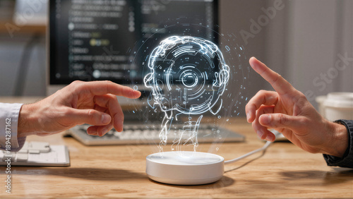 Interakcja człowieka z holograficznym modelem sztucznej inteligencji na biurku