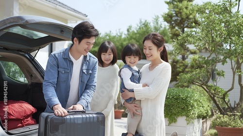 自宅前で旅行の荷物を積み込む笑顔の四人家族