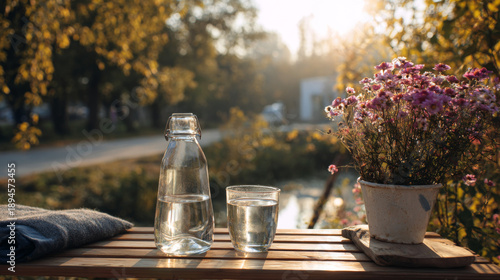 Glass bottle drinking glass water wooden table sunlight outdoor flower towel