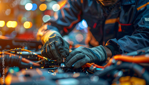 Mechanic Hands Working on Electric Car Engine in Workshop