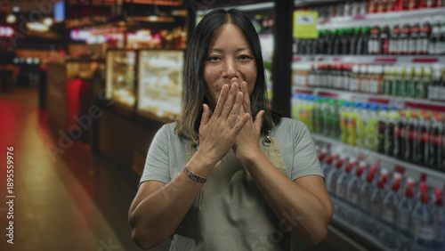 Woman with hands to mouth in restaurant building aisle showing a ring, smiling towards camera; joy gratitude warmth.
