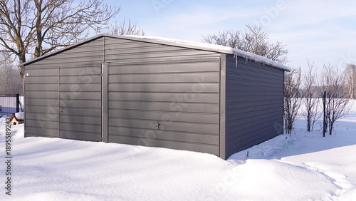 Garaż ośnieżony na dachu oraz dookoła garażu leżąca gruba warstwa śniegu.