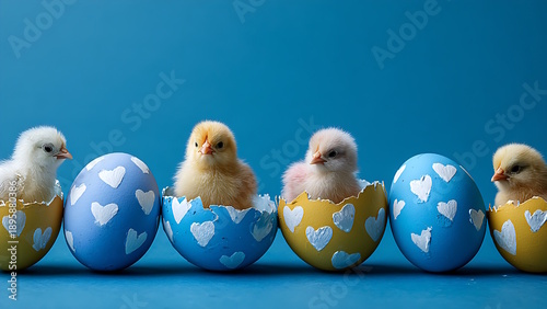 Cracked colorful easter eggs, chicks hatching from eggs, blue background.