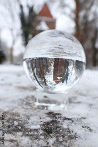 zamek na tle zimowego krajobrazu zamknięty w kryształowej kuli