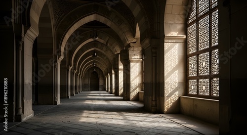 Dramatic sun rays through a mosque window, representing the divine blessings and spiritual enlightenment during the holy month of Ramadan.