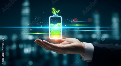 Human hand holding glowing battery hologram with sprouting leaves symbolizing sustainable energy storage innovation
