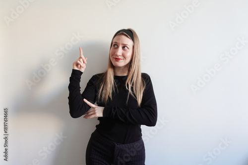 Młoda kobieta wskazuje palcem w górę, patrząc w bok, na neutralnym tle. Koncepcja idei i wskazówki.