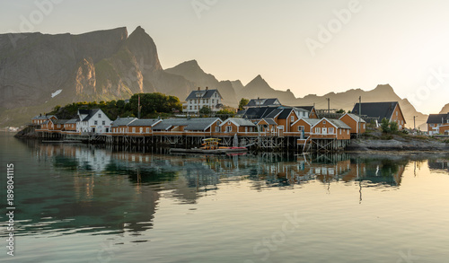 22 july 2025, Reine, Norway. Sakrisøy island, on Lofoten islands, typical wooden ochre colored buildings, mountains in background. Early morning sunlight. Wonderful travel destination, northern Europe