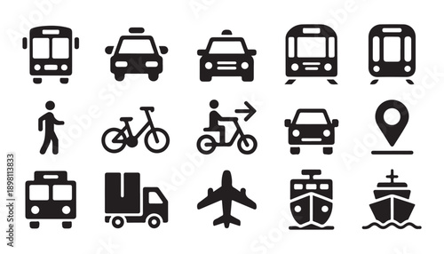 Transportation set vector icon collection isolated on white background, black flat symbol
