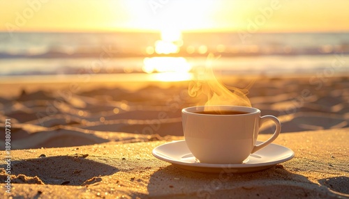 Una taza de café humeante reposa en la arena frente a un atardecer dorado sobre el océano, creando un momento de paz y calidez.
