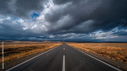 vanishing. An empty highway stretching under dramatic clouds, vanishing point adding depth to the moody landscape. travel magazines.
