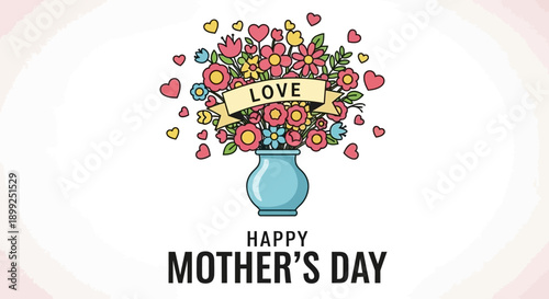 A beautiful bouquet of colorful flowers with a banner that says "LOVE" in a vase, celebrating Mother's Day.