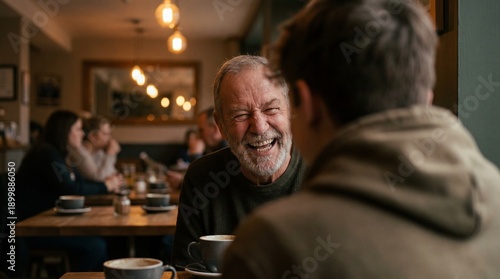 A heartwarming moment of intergenerational connection, laughter, and companionship shared over a cup of coffee in a cozy cafe, depicting the joy of connection and the beauty of shared experiences.