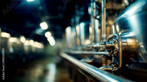 nepotism. A gleaming stainless steel fermenter with pipes in a dim cellar. bar promotions, beverage menus, packaging labels, designed for product packaging and bar promotions, used by photographers.