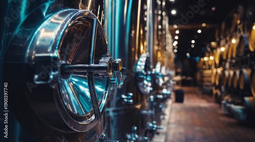 nepotism. A gleaming stainless steel fermenter with pipes in a dim cellar. bar promotions, beverage menus, packaging labels, designed for product packaging and bar promotions, used by photographers.